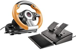 Un buon kit volante e pedali economico è lo Speedlink DRIFT OZ Racing Wheel, che dispone di un volante con 12 tasti funzione e interruttore per modalità analogica e digitale, volante gommato, raggio di sterzata di 180 gradi, effetti di vibrazione, palette del cambio posteriori e una pedaliera con freno e acceleratore.